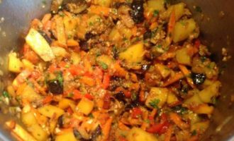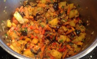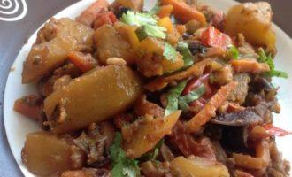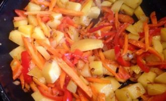 Обжарьте в разогретом масле лук до золотистого цвета, 10 мин. Добавьте морковь, картофель и сладкий перец, обжарьте все вместе на небольшом огне, помешивая, 15 мин. Переложите в кастрюлю к баклажанам.