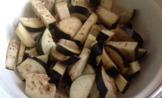 Разрежьте баклажаны вдоль, а затем ломтиками толщиной 5 мм. Положите в миску и посолите, отставьте на 30 мин. Затем промойте в холодной воде и тщательно отожмите лишнюю влагу.