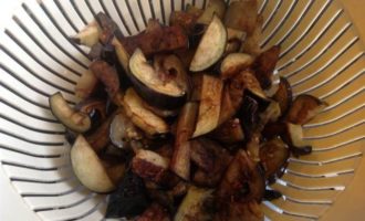Разогрейте большую сковороду с оливковым маслом и в несколько приемов обжарьте баклажаны. Готовую партию выкладывайте в дуршлаг, чтобы стекло лишнее масло, и перекладывайте в широкую кастрюлю.