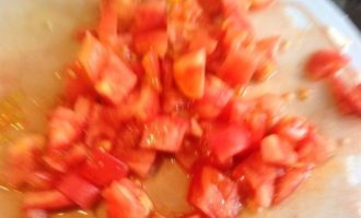 Помидоры положите в миску и залейте кипятком на 3 мин., затем обдайте холодной водой, снимите кожицу и нарежьте кубиками, переложите в кастрюлю.