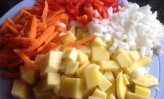 Очистите овощи. Лук нарежьте мелкими кубиками, морковь-соломкой, болгарский перец-полосками, картофель — средними кубиками.
