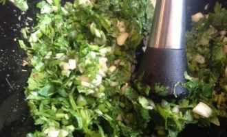 Чеснок, базилик и кинзу мелко нарежьте, положите в ступку и слегка растолките с щепоткой соли.