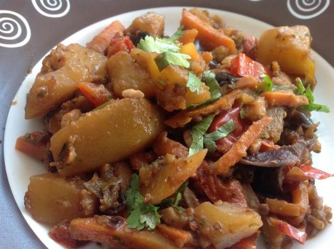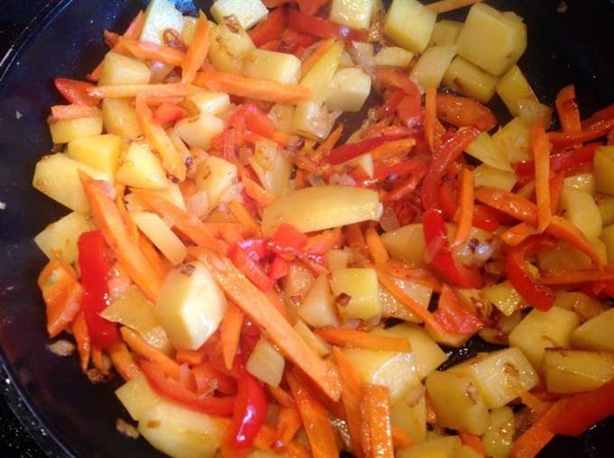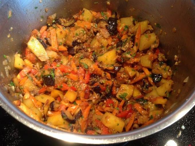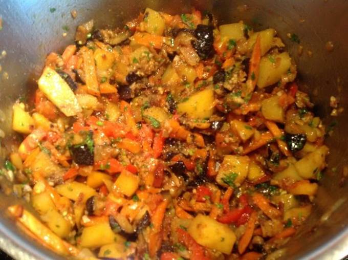 Обжарьте в разогретом масле лук до золотистого цвета, 10 мин. Добавьте морковь, картофель и сладкий перец, обжарьте все вместе на небольшом огне, помешивая, 15 мин. Переложите в кастрюлю к баклажанам.