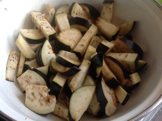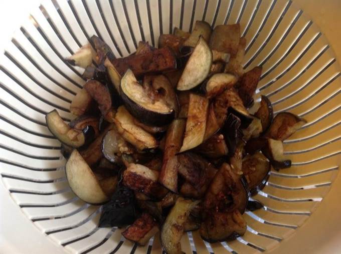 Разогрейте большую сковороду с оливковым маслом и в несколько приемов обжарьте баклажаны. Готовую партию выкладывайте в дуршлаг, чтобы стекло лишнее масло, и перекладывайте в широкую кастрюлю.