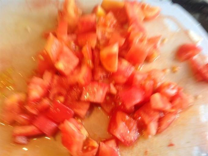Помидоры положите в миску и залейте кипятком на 3 мин., затем обдайте холодной водой, снимите кожицу и нарежьте кубиками, переложите в кастрюлю.
