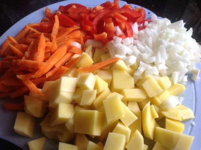 Очистите овощи. Лук нарежьте мелкими кубиками, морковь-соломкой, болгарский перец-полосками, картофель — средними кубиками.