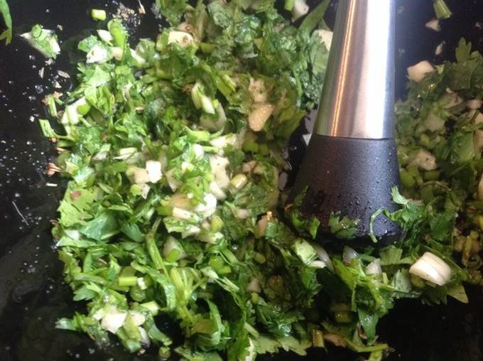 Добавьте в кастрюлю растертую зелень, острый перец и специи. Посолите и поперчите, тушите еще 10 минут. Выключите огонь и оставьте на 30 мин. под крышкой. Подавайте теплым или охлажденным.