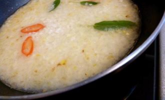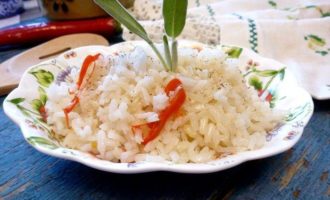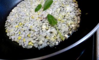 Лук и чеснок чистим и мелко режем. Размер кусочков примерно как рисинки. На рисовом масле от Biolio припустим их до прозрачности. Ни в коем случае не зажаривать! Когда лук и чеснок станут прозрачные добавим по вкусу несколько колечек чили (без семян) и несколько листиков шалфея.
