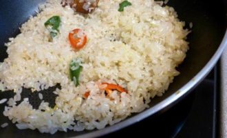 Всыпаем рис и жарим на масле пока рисинки не побелеют. Помешивайте все время.