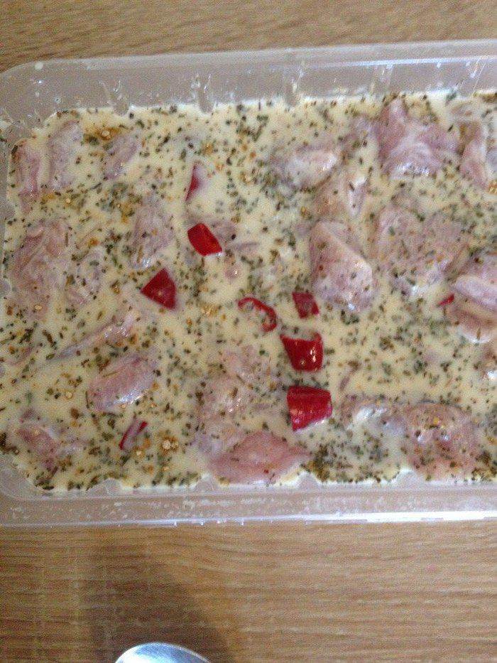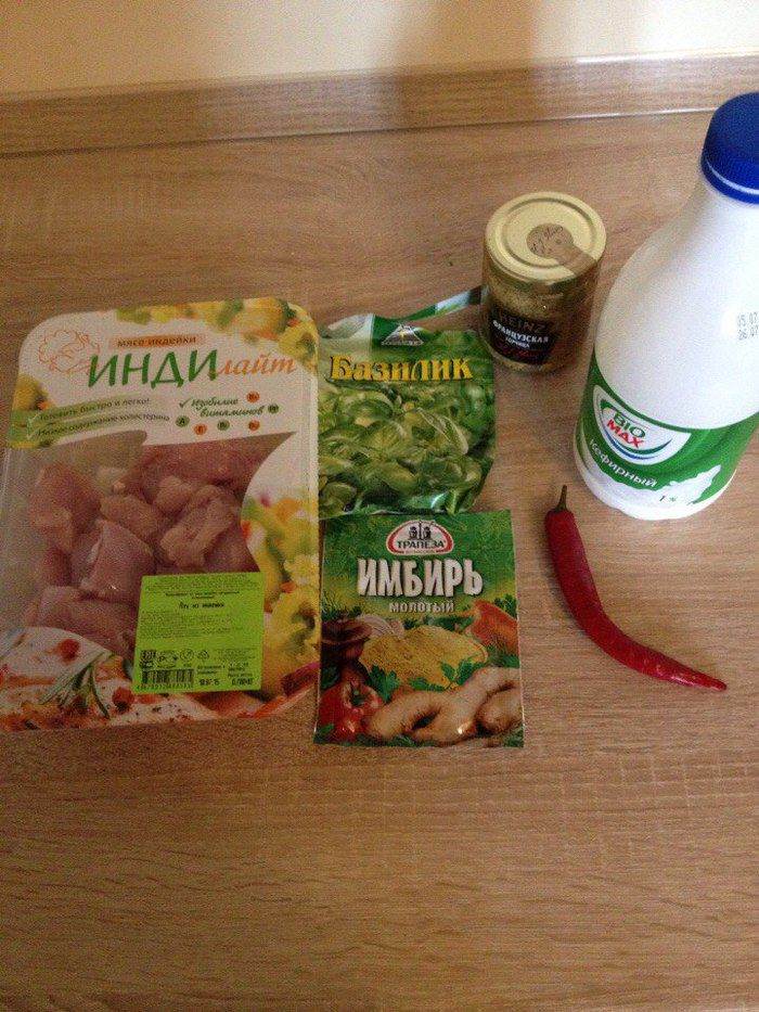 • Технология самая простая. Индейку промыть, убрать подложку, залить кефиром, добавить горчицу, базилик, имбирь и перец (я предпочитаю резать крупными кусочками, чтобы легко убрать при необходимости и снизить остроту). Дать постоять минут 10-20.
