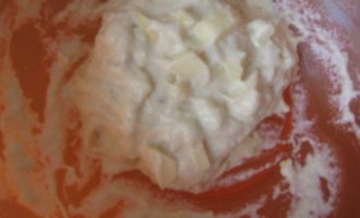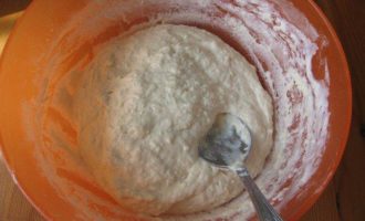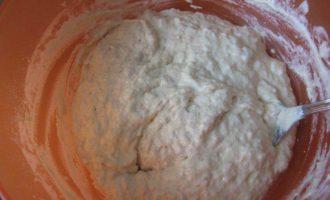 • В кефир добавить муку, тесто получается консистенции густой сметаны. Тесто разделить на 2 части.