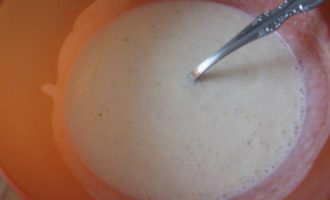 • В кефир добавить соду, соль, сахар. Перемешать, оставить на 10 минут.
