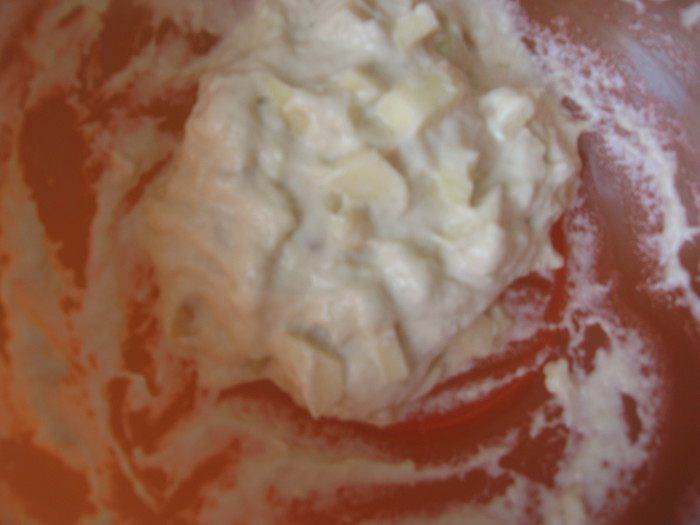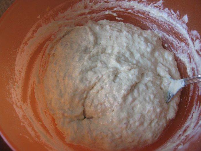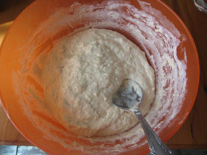 • В кефир добавить муку, тесто получается консистенции густой сметаны. Тесто разделить на 2 части.