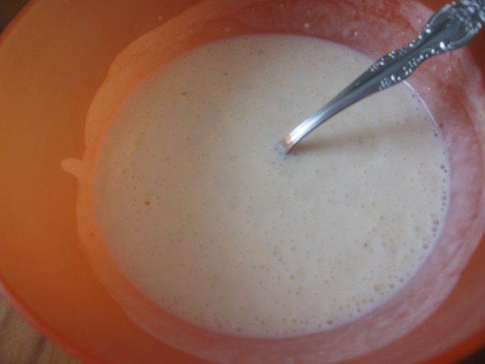 • В кефир добавить соду, соль, сахар. Перемешать, оставить на 10 минут.