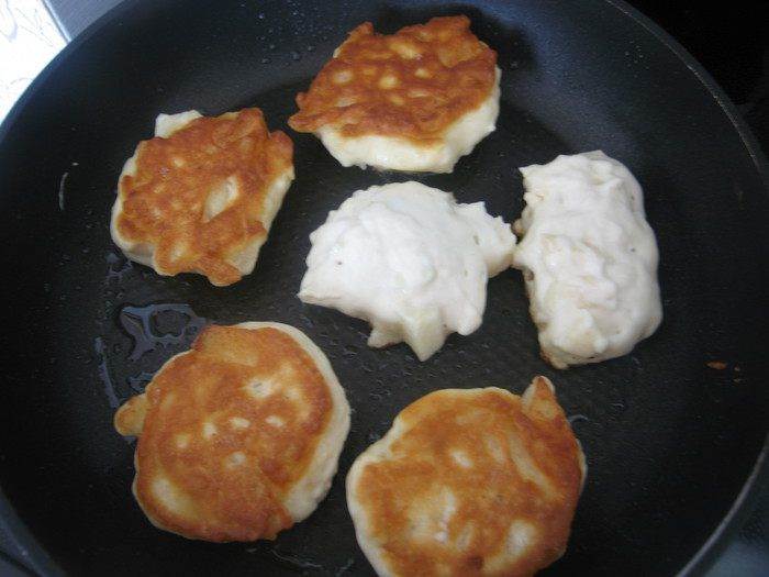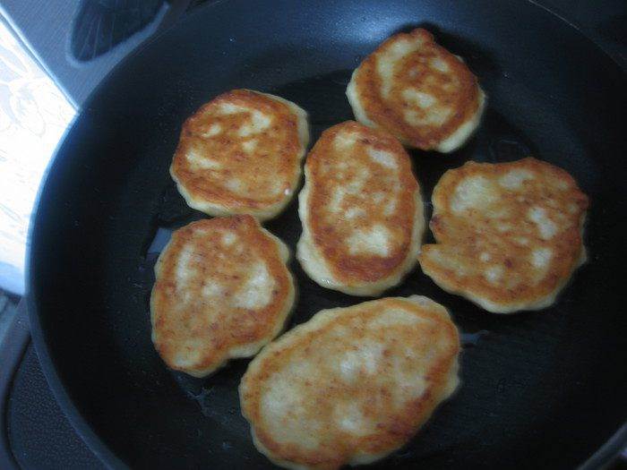 • Жарить на разогретом растительном масле. Выкладывать оладьи ложкой, предварительно обмакнув её в воду, на маленьком огне под закрытой крышкой. Это с мясом.