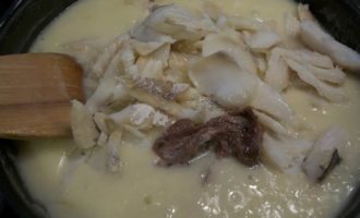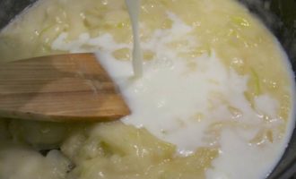 • Постепенно влить вино и оставшееся молока. Дать соусу закипеть, помешивая, уменьшить огонь и поварить 3 минуты.