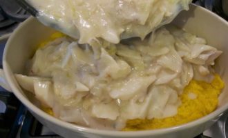Вымоченную треску положить в большую кастрюлю, залить 2,5 л холодной воды. Довести до кипения, слить воду, налить новую и снова довести до кипения. Уменьшить огонь, накрыть и варить 15-20 минут, пока слои рыбы не будут легко отставать.