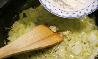 • Добавить к луку муку и измельченный чеснок. Подержать 1 минуту на огне.