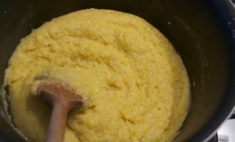 • Нагреть духовку до 200 С. Оставшуюся воду (0,5 л) вылить в кастрюлю, взболтать в ней кукурузную крупу и, помешивая, довести до кипения. Добавить соль и сыр. Уменьшить огонь и варить еще минут 15, помешивая.