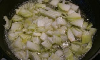 • Растопить масло в другой кастрюле, чуть потомить в нем лук.