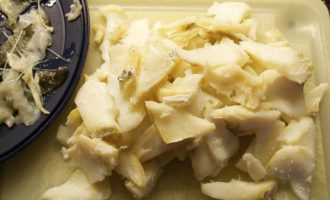 • За это время треску вынуть из воды, в которой она варилась, дать воде стечь, очистить от костей и кожи, расслоить рыбу. Тоже проделать с анчоусами, порезать их.
