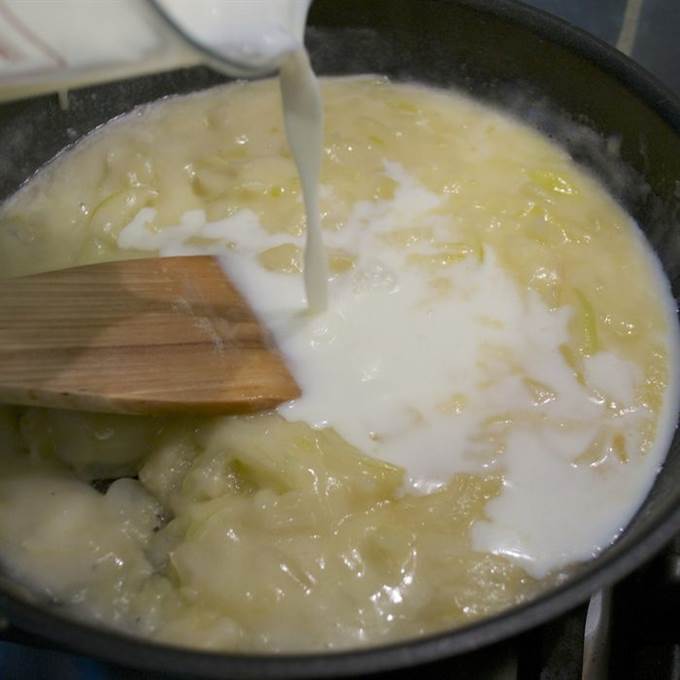 • Постепенно влить вино и оставшееся молока. Дать соусу закипеть, помешивая, уменьшить огонь и поварить 3 минуты.