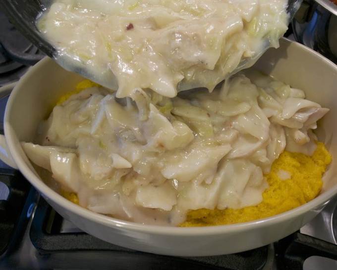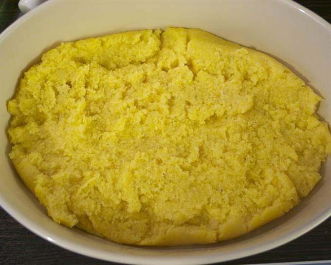 • Затем выложить поленту в смазанное жиром огнеупорное блюдо, выровнять поверхность и выпекать в духовке 25 минут.