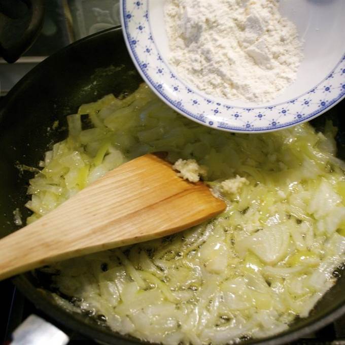 • Добавить к луку муку и измельченный чеснок. Подержать 1 минуту на огне.
