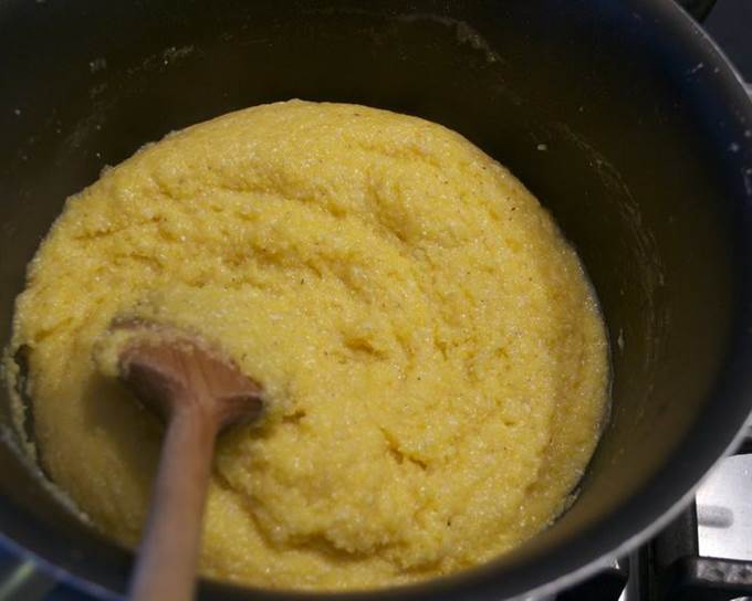 • Нагреть духовку до 200 С. Оставшуюся воду (0,5 л) вылить в кастрюлю, взболтать в ней кукурузную крупу и, помешивая, довести до кипения. Добавить соль и сыр. Уменьшить огонь и варить еще минут 15, помешивая.