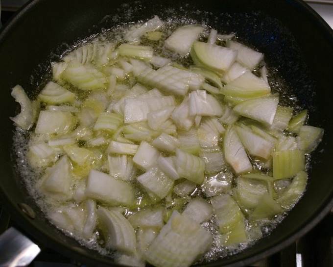 • Растопить масло в другой кастрюле, чуть потомить в нем лук.