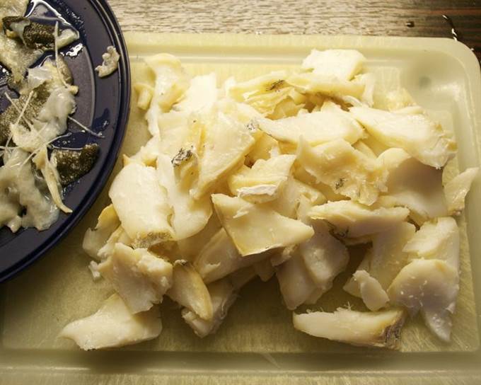 • За это время треску вынуть из воды, в которой она варилась, дать воде стечь, очистить от костей и кожи, расслоить рыбу. Тоже проделать с анчоусами, порезать их.