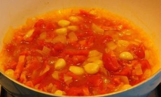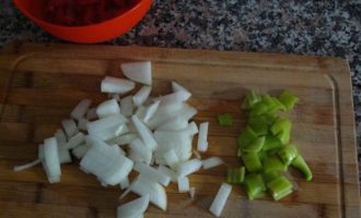 Крупную луковицу нарезать не очень мелко. Помидоры очистить от кожи и нарезать кубиками. Перец (можно не добавлять) нарезать. Перец, опять же, по желанию, может быть острым.