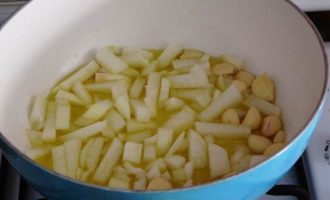 На оливковом масле слегка обжариваем лук и чеснок. Чеснок мне нравится оставлять целым. Очень украшает блюдо.