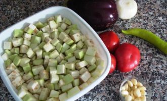Я использовала один круглый крупный баклажан. Его надо очистить, нарезать кубиками и погрузить в соленую воду на 15 минут. Чеснок почистить.