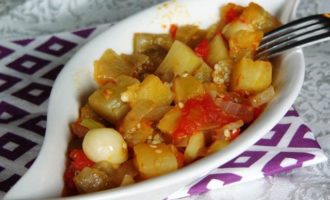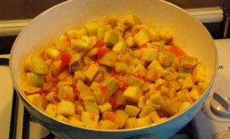 Баклажаны отцеживаем, промываем, отжимаем от воды и добавляем в сотейник. Тушим овощи около 15 минут под крышкой.