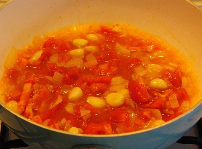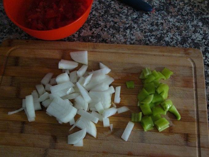 Крупную луковицу нарезать не очень мелко. Помидоры очистить от кожи и нарезать кубиками. Перец (можно не добавлять) нарезать. Перец, опять же, по желанию, может быть острым.