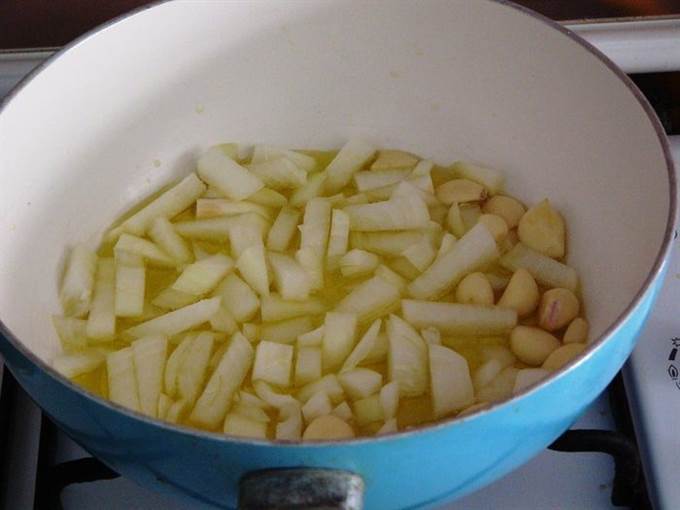 На оливковом масле слегка обжариваем лук и чеснок. Чеснок мне нравится оставлять целым. Очень украшает блюдо.