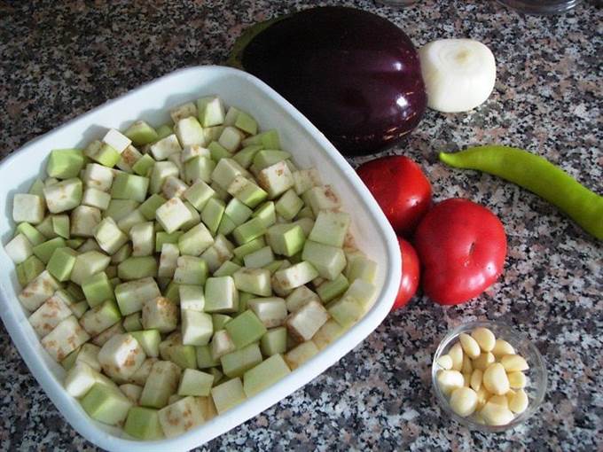 Я использовала один круглый крупный баклажан. Его надо очистить, нарезать кубиками и погрузить в соленую воду на 15 минут. Чеснок почистить.