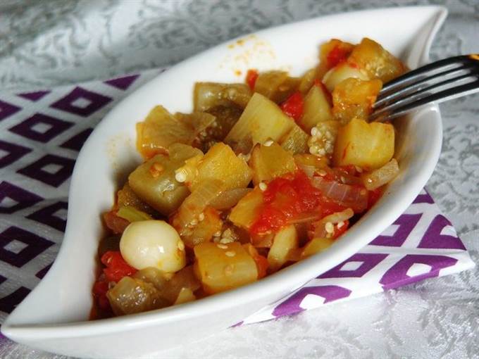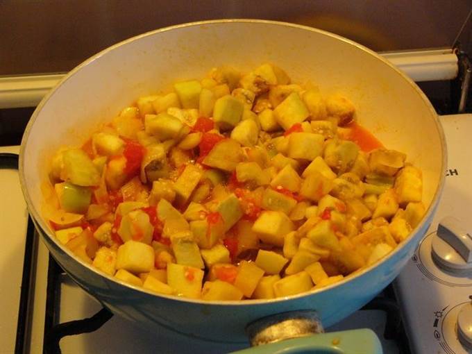 Баклажаны отцеживаем, промываем, отжимаем от воды и добавляем в сотейник. Тушим овощи около 15 минут под крышкой.