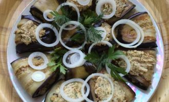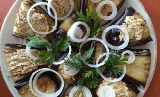 Сервируем баклажаны на большой плоской тарелке, украсив кольцами лука и веточками петрушки.