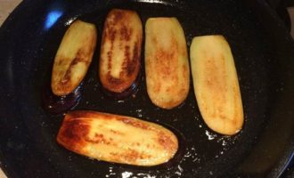 • Баклажаны помыть, порезать вдоль на полоски толщиной 1-1,5 см, посолить и оставить на 30 мин. Затем обжарить баклажаны на растительном масле с двух сторон до золотистого цвета, выложить на бумажные салфетки и дать впитаться лишнему маслу.