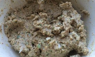 • Смешать орехи, лук, зелень, посолить по вкусу. Добавить уксус (уксус можно заменить гранатовым соком, но у меня его просто не было).