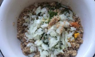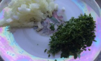 • Лук, зелень петрушки и кинзы очень мелко измельчить.