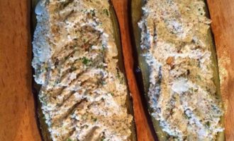 • Теперь берем кусочки баклажана и выкладываем на них пасту сациви.