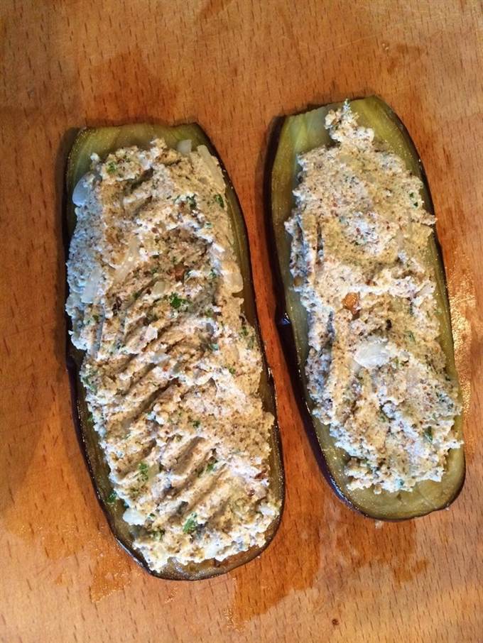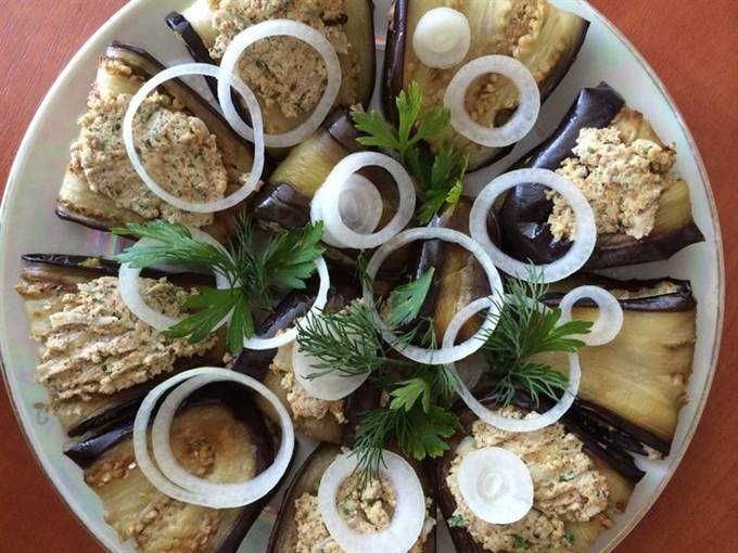 • Теперь берем кусочки баклажана и выкладываем на них пасту сациви.