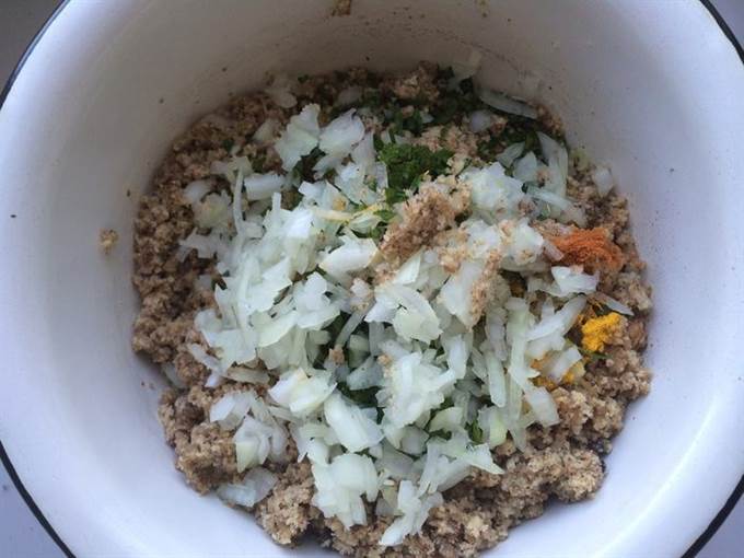 • Лук, зелень петрушки и кинзы очень мелко измельчить.