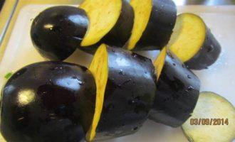 У баклажанов (берем крупные) удаляем кончики и разрезаем их поперек на 4 части. Солим, кладем в дуршлаг и оставляем минут на 30, чтобы горечь ушла (я этот этап пропускаю). Промываем их под холодной водой. В рецепте баклажаны предлагают готовить в пароварке — минут 20, до мягкости. Я так и сделала, было интересно, как они получатся. А можно их запечь до готовности в духовке, кому как больше нравится.