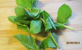 Пока баклажаны готовятся, сделаем заправку для них. У мяты листочки отделяем от стеблей и режем крупно. Зеленый лук рубим мелко (у меня его в этот раз не оказалось под рукой).