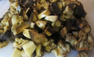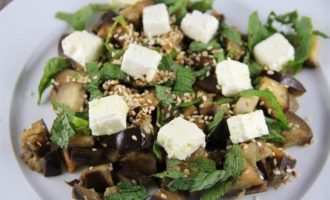 Баклажаны режем кубиками. Перекладываем их в миску с соусом. Присыпаем мятой и кунжутом, перемешиваем и даем настояться минут 10.