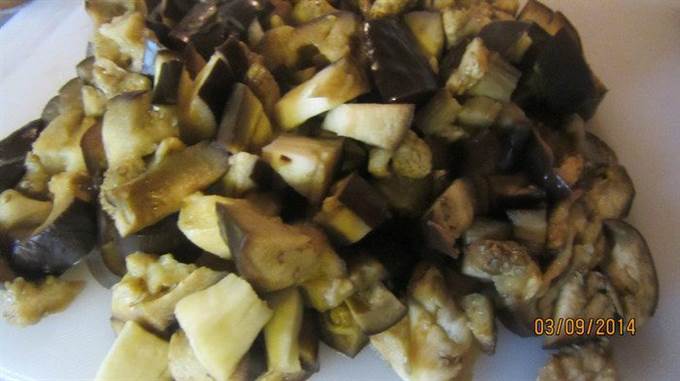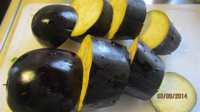 У баклажанов (берем крупные) удаляем кончики и разрезаем их поперек на 4 части. Солим, кладем в дуршлаг и оставляем минут на 30, чтобы горечь ушла (я этот этап пропускаю). Промываем их под холодной водой. В рецепте баклажаны предлагают готовить в пароварке — минут 20, до мягкости. Я так и сделала, было интересно, как они получатся. А можно их запечь до готовности в духовке, кому как больше нравится.